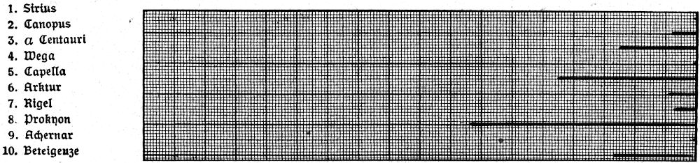 [4] Anmerkung. Alle Zahlenangaben sind heute sehr unzuverlässig geworden, da durch die neuen photographischen Verfahren beständig viele neue Entdeckungen gemacht werden. Neulich teilte z. B. Wolf in Heidelberg die Auffindung von nicht weniger als 35 veränderlichen Sternen allein im Orionnebel mit. Ein bis 1900 fortgesetzter Katalog der Veränderlichen, von Miß Cannon hergestellt, enthält 737 Nummern.