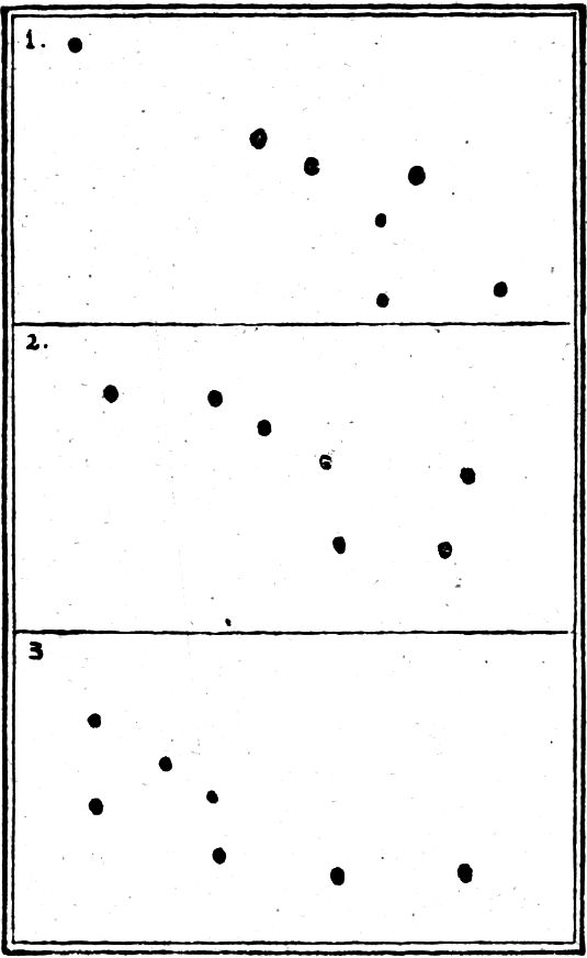 Es scheint nun, daß nicht nur die Sonne mit ihren Planeten, sondern daß selbst gewisse Gruppen von Sonnen einen gemeinsamen Ursprung gehabt haben, da sie in derselben Richtung im Raume weiterziehen. So scheinen einige Sterne des Himmels denselben Weg zu gehen, so daß sie also wirklich und nicht nur scheinbar ein zusammengehöriges Ganzes sind. Da andere Sterne des Bildes aber andere Richtungen haben, so muß es mit den Jahrtausenden eine völlig andere Gestalt gewinnen. Hier ist das Sternbild des Großen Bären abgebildet, wie es vor 50 000 Jahren ausgesehen haben muß, wie es jetzt ist und abermals nach 50 000 Jahren aussehen wird.