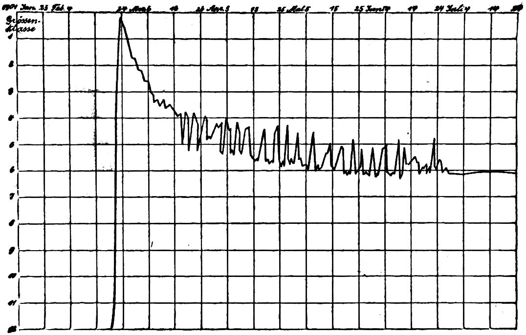 Als nun unser Stern bis Mitte März, etwa drei Wochen nach seinem Erscheinen, bis gegen die Grenze der Sichtbarkeit mit dem bloßen Auge abgenommen hatte, zeigte er eine neue wunderbare Erscheinung: Sein Licht nahm in regelmäßigen Zwischenräumen von etwa vier Tagen um anderthalb Größenklassen ab und zu, er war ein veränderlicher Stern geworden. Die untenstehende Kurve zeigt die Lichtschwankungen vom 16. März bis zum 24. Juli 1901. Schon der Anblick dieser Kurve allein stellt uns die Gewalt und Wildheit der Katastrophe vor Augen. Wir müssen annehmen, daß ein Teil der Massen, die hier zusammenstießen, die Hauptmasse sehr schnell umkreiste. Dies spricht für die Ansicht Seeligers, nach der gewisse neue Sterne dadurch aufleuchten, daß sie in eine Wolke kosmischen Staubes oder Nebels, oder endlich von Meteoriten geraten, die dann mit immer beschleunigterer Geschwindigkeit auf sie stürzen.