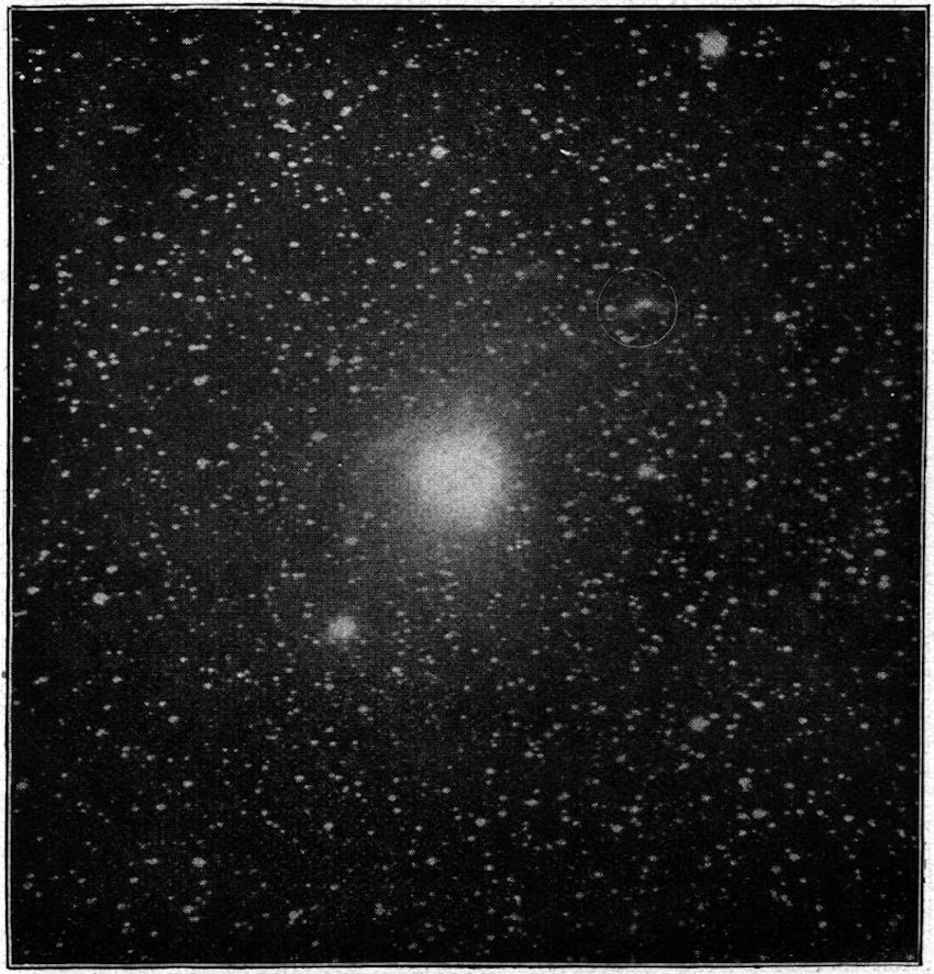 Aber die Wunder dieses Sternes steigerten sich noch immer. Man sah, wie es auf den Bildern S. 77 u. 78 auch zu erkennen ist, in dem Nebel einzelne Flocken, die im Laufe der Monate zwar in ihrer Form ungefähr bestehen blieben, aber deutlich die Reise vom Zentrum nach der Peripherie mit derselben Geschwindigkeit machten, wie der Nebel selbst sich ausbreitete. Auf den beiden Aufnahmen ist dieselbe Wolke mit einem Kreise umgeben; durch Vergleichung mit den nebenstehenden Sternen sieht man ihre Bewegung. Hier sah man also wirkliche, materielle, leuchtende Massen, die mit voller Lichtgeschwindigkeit vom Mittelpunkte der Katastrophe in den Weltraum hinausgeschleudert wurden.