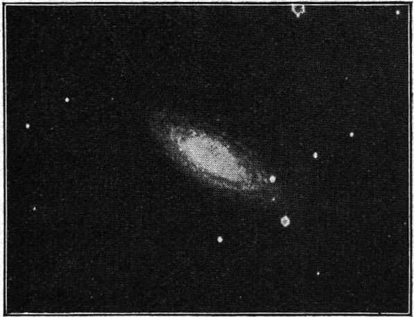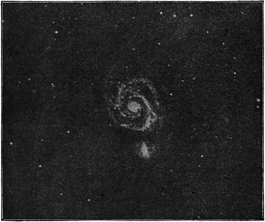 Noch eine andere Spirale ist hier abgebildet. In ihr trachtet die Nebelmasse sich zu Sternen zu verdichten. Auch die außen befindlichen Sterne zeigen zum Teil eine Anordnung, die die Vermutung zuläßt, daß sie einmal zu der Spirale gehörten, nun aber schon längst alle Nebelmasse in sich vereinigt haben. So sehen wir in den verschiedenen Einzelobjekten eine Entwicklungsreihe der Weltenbildung vor uns.
