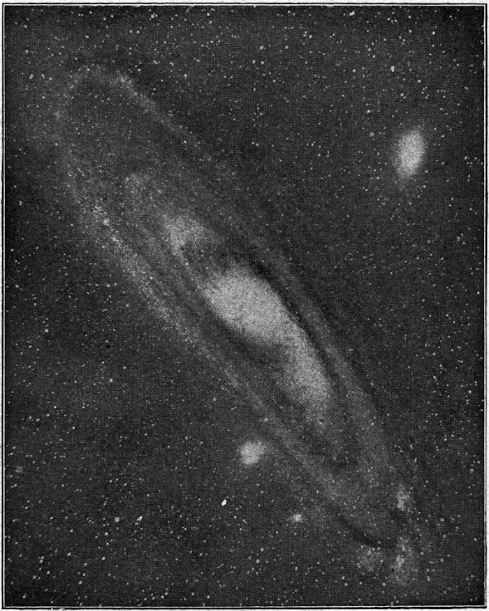 Ganz Ähnliches sieht man an dem großen Nebel in der Andromeda, den wir mehr von der Seite sehen als den in den Jagdhunden, aber wir können auf der Photographie die einzelnen Windungen doch deutlich unterscheiden. Hier befinden sich in der Lichtmasse überall besondere Knoten, ähnlich wie sie der Nebel um den neuen Perseusstern aufwies.