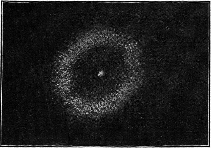 Allmählich werden sich die Spiralen zu Ringen zusammenzuziehen suchen. Denn alles strebt zu vollkommenerer Ordnung. Der schönste dieser Nebelringe ist der im Sternbilde der Leier. Es schien im Sinne unseres Entwicklungsgedankens, den wir hier andeutungsweise[85] verfolgten, merkwürdig, daß das Innere dieses Ringes leer war. Denn überall in den uns bekannten Systemen befindet sich eine Zentralkraft, die nötig scheint, wenn sich die Materie zu regelmäßigen Formen verdichten soll. Hier hat die Photographie abermals ein Rätsel gelöst. Sie allein zeigt den vermißten Zentralstern. Der photographische Apparat reagiert ja bekanntlich auf Lichtarten, die dem Auge auch in den besten Fernrohren unsichtbar bleiben, auf das sogen. ultraviolette Licht. Der zentrale Teil dieses Ringnebels sendet hauptsächlich nur solches Licht aus.