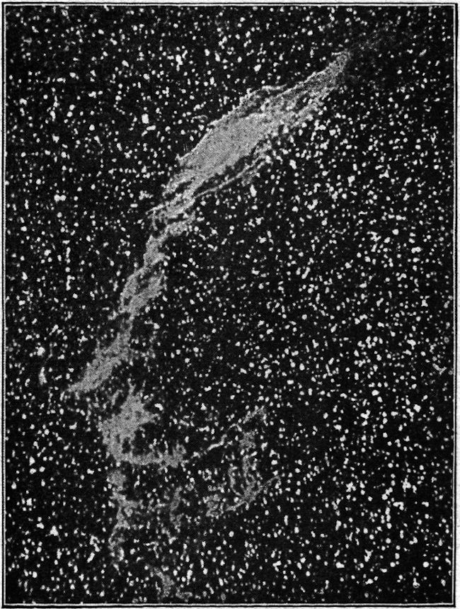 Es gibt am Himmel natürlich auch unregelmäßige Nebel, aber vielfach zeigen auch sie in ihrer Gestalt Andeutungen von Vorgängen, die wir bisher verfolgt haben. Man sehe sich den völlig zerrissenen Nebel im Schwan an (S. 84). Ist es nicht, als ob ein Gigant des Weltraums eine Tabakswolke ausgeblasen hätte? Hier muß doch etwas hindurchgefahren sein, um die Materie so auseinanderzuzerren.