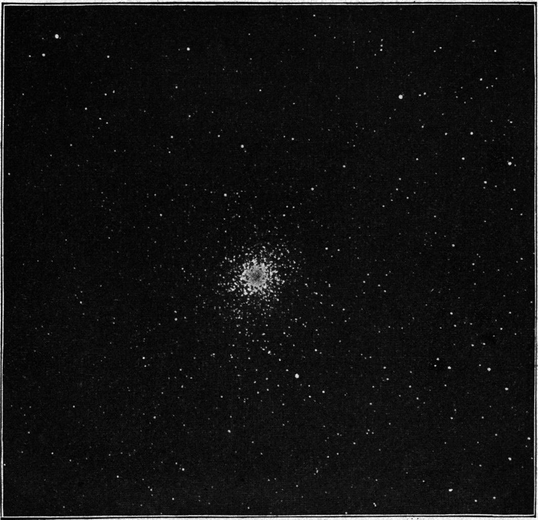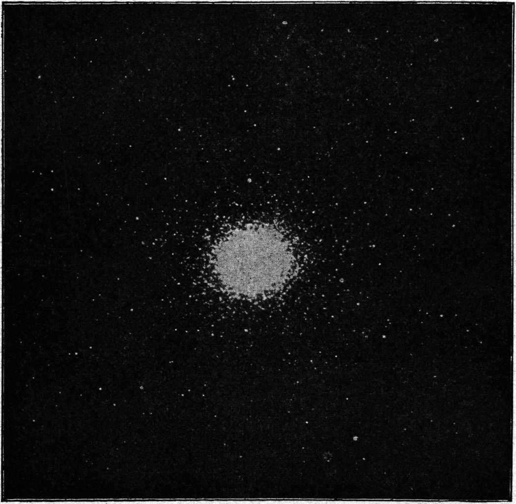 Es mag aber auch wohl kommen, daß solche Nebelmasse niemals den weltenbildnerischen Anstoß findet. Dann muß sie sich aus ihrer eigenen Kraft heraus fast unendlich langsam verdichten. Waren schon ursprünglich die Massen ungleich verteilt, so bilden sich einzelne Verdichtungsknoten. Jede Verdichtung erzeugt Wärme, der Nebel zerfällt in eine Unzahl einzelner Sterne, er wird zu einem Sternhaufen; das sind wundervolle Himmelsobjekte, funkelnd und leuchtend wie eine Handvoll in die Nacht ausgestreuter Diamanten. Hier ist der Sternhaufen im Herkules nach einer Originalaufnahme des Harvard College-Observatoriums in Cambridge (V. St.) abgebildet, und weiterhin der große Sternhaufen im Zentauren (S. 88). Wie drängen[88] sich hier die Sterne zusammen, daß sie in der Mitte nur zu einem einzigen Lichtschimmer zusammenfließen! Wieviel Tausende von Sonnen umschließt wohl dieses kleinere Universum?