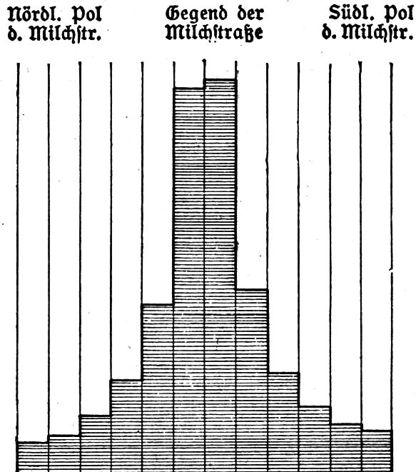 Dieser leuchtende Gürtel ist nichts für sich Bestehendes. Nur für unser bloßes Auge scheint er am Himmelsgewölbe verschwimmende Grenzen zu zeigen. In Wirklichkeit nimmt die Sternenfülle am Himmel ganz allmählich von den Punkten, die am weitesten von[89] dem Gürtel entfernt sind, den Polen der Milchstraße, bis zu ihr hin zu. Das untenstehende Diagramm veranschaulicht das. Es ist danach kein Zweifel, daß alle Sterne, auch die einzeln über den Himmel verteilten, einer größeren Vereinigung von Sternen, einem größeren Weltenkomplexe angehören, wovon die eigentliche Milchstraße nur der am dichtesten gedrängte Teil ist. Durch die Abbildung auf S. 54 haben wir schon einen Blick in die Fülle geworfen, wie sie die photographische Platte uns enthüllt. Wie viele Tausende von Sonnen, jede vielleicht von bewohnten Welten umkreist, überschaut hier zugleich das erstaunte Auge! Überkommt uns nicht eine weihevolle Stimmung, wenn wir bedenken, daß hier das Wohl und Wehe von vielleicht ungezählten Millionen verwandter Seelen für uns zusammenschmilzt in diese flimmernden Lichtpünktchen?