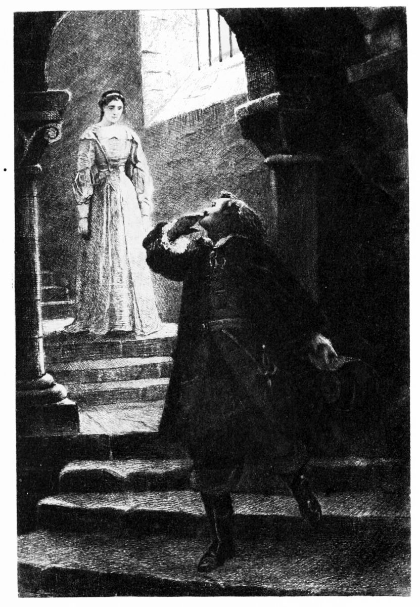The crowd steadily increased. Just at this instant, a young man who was crossing the wharf, seeing the mob of people, dismounted from his horse, handed the bridle to the servant behind him, and entered the Spladgest. He wore a simple travelling dress, was armed with a sword, and wrapped in a large green cloak; a black plume, fastened to his hat by a diamond buckle, fell over his noble face and waved to and fro upon his lofty brow, shaded by{32} chestnut hair; his boots and spurs, soiled with mud, showed that he had come a long distance.