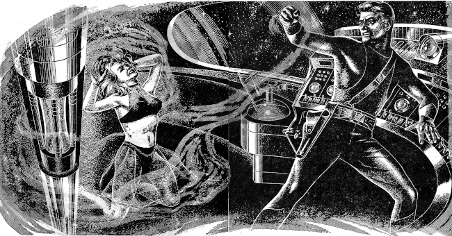Kruze again; words coming from afar: "No noise, now, Traynor! As you warned me, we mustn't attract the attention of my guards. We'll just leave the way you came—down the shaft-lift, into the space-warp, and then away on a little trip."
