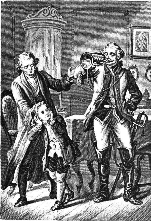 At that instant the house door opened, men’s voices were heard in the hall, and soon Vice Chapelmaster Leopold Mozart entered with some of his friends. Wolfgang joyously flew to him and embraced him. “God greet you, father,” he cried. “I congratulate you a thousand times on your birthday.”