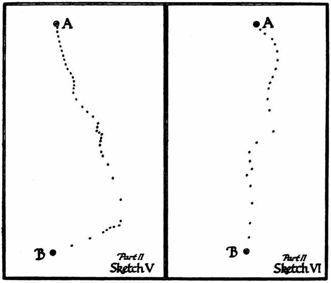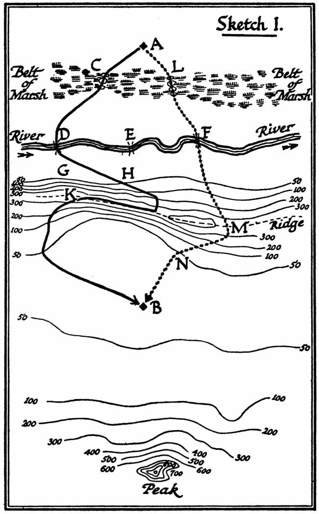 I maintain that of the two theories the second is just: that a gradual experimental growth in its roads, a method coincident with local caprice, burdens with imperfect communication the society adopting it; that conscious design is essential to efficiency. And this I propose to illustrate by a single example. Take two points A and B, such that a line joining them must lead across a marsh, a river, and a range of hills. Let some primitive wanderer make his way from A to B, knowing, when he is at A, the direction of B by, let us say, a distant peak overtopping the range between. That primitive wanderer would first of all skirt about the marsh and,[9] finding its narrowest place at C, would set to work and make his causeway there. Having crossed it, he would come to the river. He must either swim or ford it. Supposing him to prefer, through the necessity of a pack or what not, to ford it, he casts about for a ford. He finds one at D, and perhaps he also, if he takes time to look about him, finds another deeper one at E and another at F, but as his causeway is near D he takes that ford.