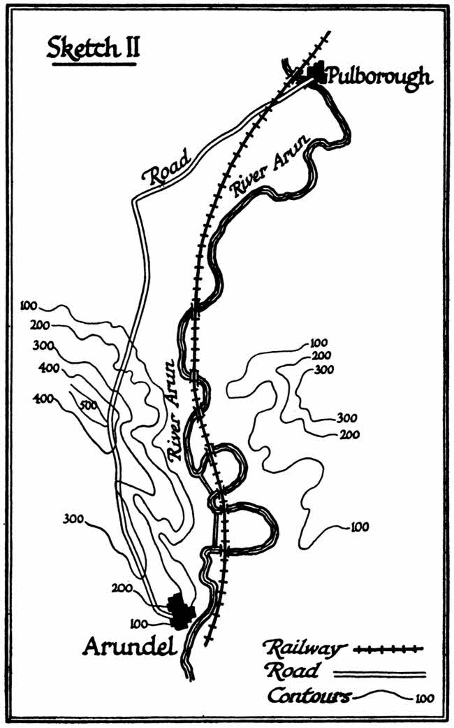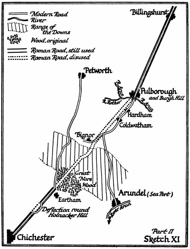 There remained no reason for using the Stane Street as a continuous line. It now led nowhere. When it meets with its first great obstacle going north, the woods near Eartham, it makes for the next centre of population—Petworth, where there was a fortified post going back to some very early time. The wood deflects the road towards Duncton Hill (I have quoted this example in my section on vegetation in the earlier part of this essay). Beyond Petworth it had little function, so this first ten miles of the Stane Street becomes the parent of the local Chichester-Petworth road which grew up out of it, leaving a gap where the[168] woods intervened. Next you must note the local roads beyond this gap. Pulborough Bridge probably survived, but the causeway could not be kept up, or was ill kept up. In its original line, when it served the camp at Hardham, it[169] ran over a wide part of the marsh. In the Dark Ages men picked their way over the narrowest part of the marsh and then followed the hard bank above the Arun-flooded levels, linking up the villages as far as Bignor. But there the use of the road ended. The “potential” was from Pulborough to the nearest seaport, which was then Arundel. And all that the Roman road did in this section was to throw out this bow or curve of lateral road eastward between Pulborough and Bignor, the line of main local travel being diverted from Bury over Arundel Hill and so seaward.