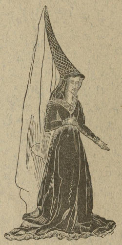 In France, during the reign of Charles VIII., in 1483, it is recorded that head-dresses were lowered considerably; but in the portrait of Mary of Burgundy, we find that she still wore the favorite towering cap that had been fashionable for two hundred years before her time, with the veil hanging to the ground and a square piece lying upon the neck and shoulders.