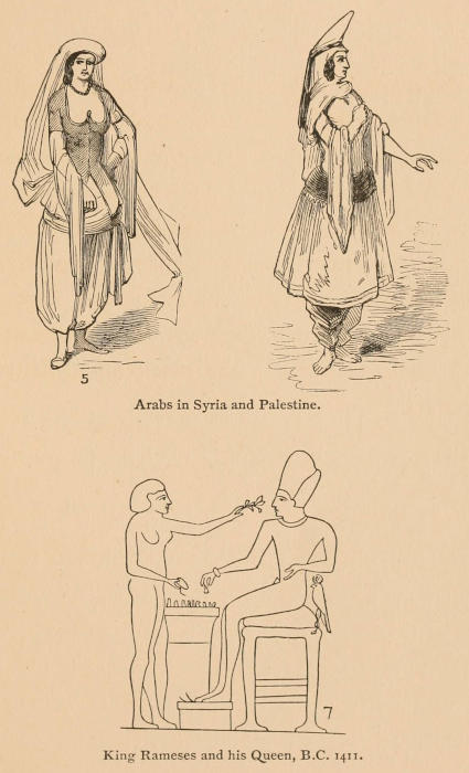 The researches of scholars and critics which have been so generously and successfully lavished, for the last two centuries, upon the ruins of Egypt, are perfectly marvellous, and only increase our desire to be more acquainted with its customs, of which we can find but little in the way of head-dress to ornament these pages. Figure 7, on the opposite page, represents King Rameses First and his queen, who reigned through the most illustrious period of Egyptian history, in the nineteenth dynasty, about 1411 B.C.