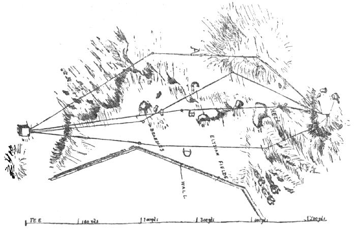 At the fourteenth hole at St. Andrews this tilt of the green has a considerable influence on the tee shot 530 yards away. Some years ago there were four of us playing four ball matches nearly every day for a month. We, according to our own judgment, attempted to play this hole in four different ways. A played his tee shot well away to the left of the Beardies on to the low ground below the Elysian Fields, so as to place his second in a favourable position for his approach. B, who was a long driver, attempted to carry the Beardies with his drive, Hell with his second, and run up his third.[106] C, who was a short but fairly accurate hitter, attempted to pinch the Beardies as near as he dare, and then played his second well away to the left, so as to play against the slope of the green for his third. D took what was apparently the straightforward route along the large broad plateau of the Elysian Fields, and eventually landed in Hell or Perdition every time: he invariably lost the hole.