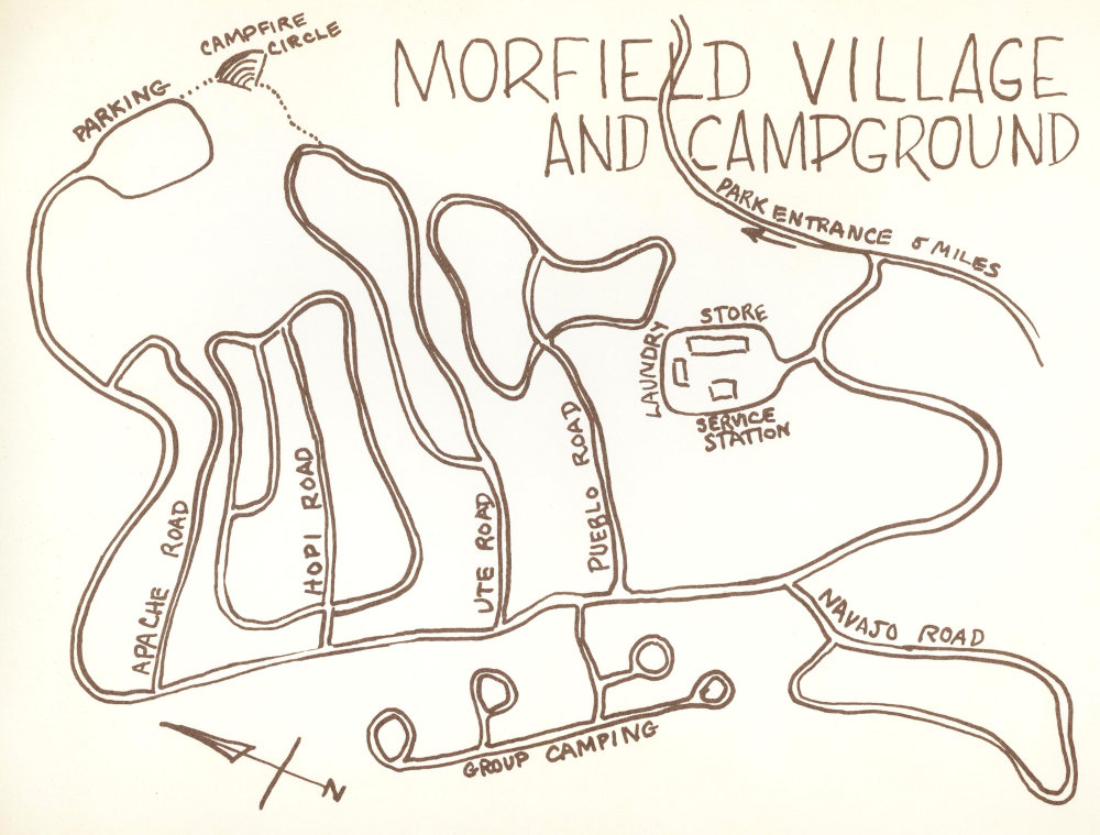 ENTERING THE PARK: Entering Mesa Verde is a breathtaking experience. Spectacular views confront the visitor as the road ascends for 5 miles to a high valley. This valley is an important activity center—the MORFIELD CAMPGROUND-VILLAGE complex. Just off the entrance road are 500 individual and group campsites, a 1500 seat amphitheatre, horseback riding and a shopping center. Approximately 10 miles past Morfield the road reaches another important point of activity. The National Park Service has located there the NAVAJO HILL VISITOR CENTER. On the gentle summit above the visitor center is the FAR VIEW MOTOR LODGE. On the road one mile south is Far View Ruin, a large surface pueblo important to the interpretation of Mesa Verde. The final four miles of the road descend gently through the forest to SPRUCE TREE, the Park Headquarters Area. The principal interpretative activity is here overlooking Spruce Tree Ruin, the third largest and, perhaps, the best preserved of the classical pueblo cliff dwellings.
