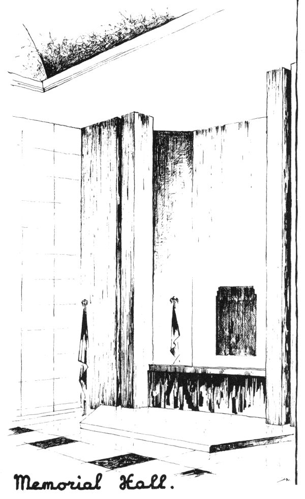 As the president of the Junior Chamber of Commerce had promised in the earliest plans for the Coliseum, the memorial to the war dead is the focal point of the building. The main entrance on the north leads directly to the Memorial Hall. Five cast aluminum heads have been placed on the exterior of the building above the windows of the hall. These heads symbolize the Army, Navy, Marine Corps, Coast Guard, and Air Force. The interior of the august hall measures seventy-five feet in length and thirty feet in width. Four kinds of marble are used in the decoration: French Notre Dame for the background, English Renfrew for the inserts, Italian Red Levanto for the platform, and Spanish Bois Jourdan for the door panels. Two bronze plaques, one at either end of the hall, list the casualties of Allen County beneath the following inscription: “This Coliseum is dedicated as a living memorial in honor of these men and women who gave their lives in World Wars I and II of the nation so that we might live.”