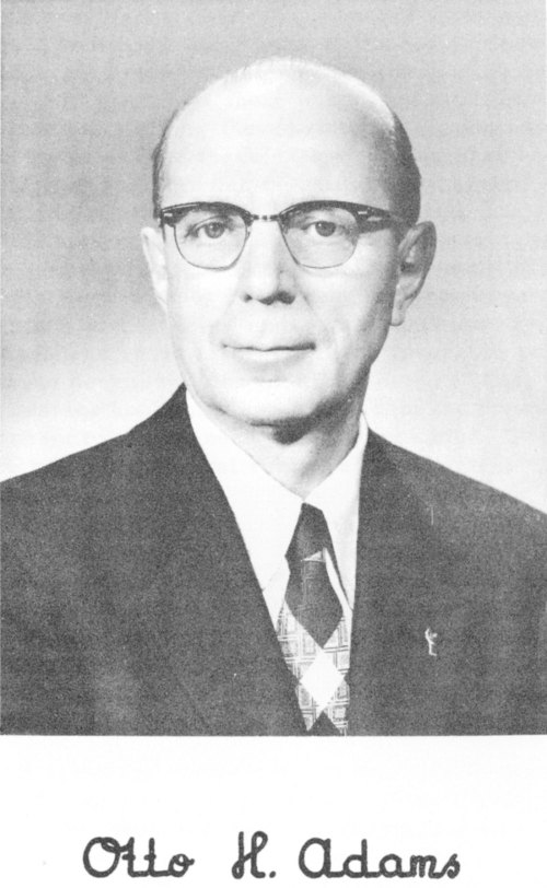 Otto H. Adams was one of the first appointees to the War Memorial Commission, which was organized in 1946 to plan a coliseum. He served as a member until the commission was superseded by the Coliseum Board of Trustees; he was then appointed to this official governing body. In January, 1954, he was elected president of the board; previously he had been vice-president and secretary.