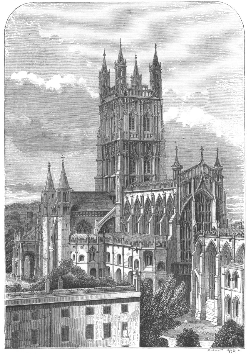 Notwithstanding the long siege of the city, Gloucester Cathedral suffered but little during the Civil War. Within the last ten years (1853-1863) extensive restorations have been made within and without the cathedral, under the superintendence of Mr. F. S. Waller. These consist chiefly of the clearing and drain{6}ing of the crypt; the restoration of the west front, the south aisle of the nave, the chapter-room, the library and sacristies, portions of the cloisters, the whole of the east end of the choir, and the interior of the nave: to which must be added the alterations entailed in forming and laying out the grounds round nearly the whole of the cathedral; several houses and yards having been removed, and hundreds of loads of soil, the accumulation of years, taken away from against the walls.