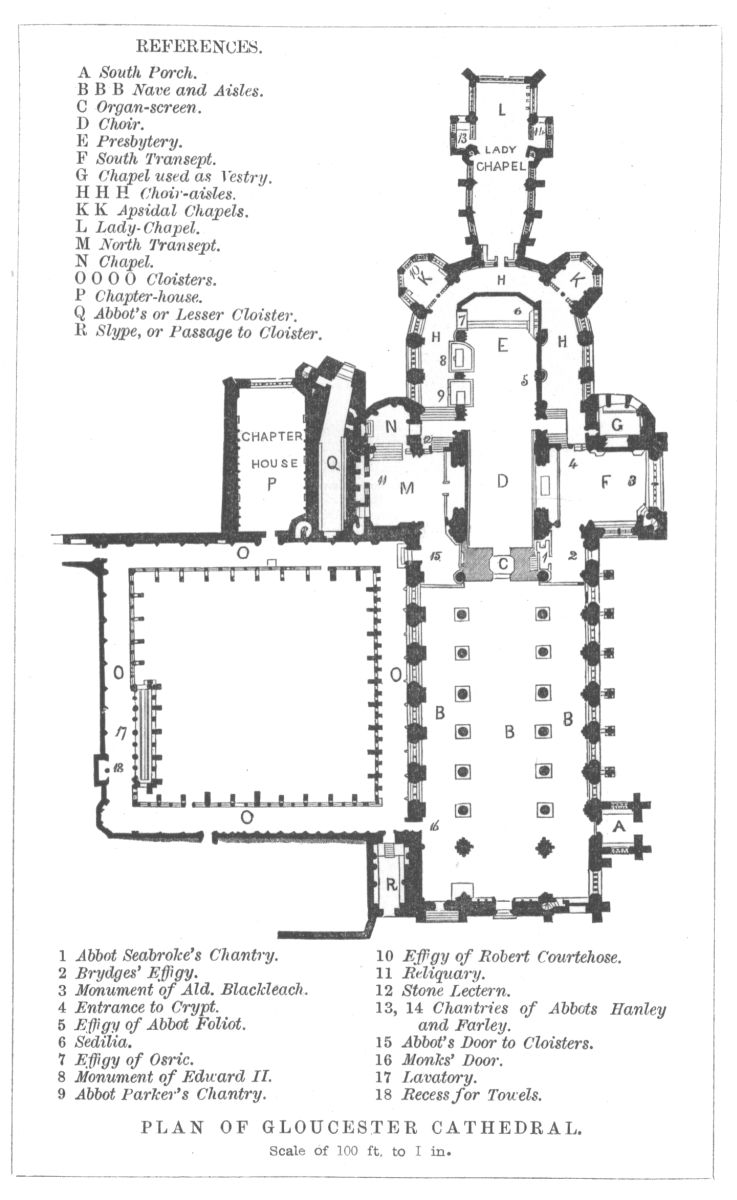 A nunnery was founded at Gloucester in the year 681, by Osric, a “minister” or “sub-regulus” of Ethelred, King of Mercia. Three abbesses ruled it successively until 767, after which the convent was dispersed. Beornulph of Mercia refounded it, about 821, for secular priests,—who, in 1022, were replaced by Benedictine monks. The Saxon Chronicle (A.D. 1058) records the “hallowing” of the monastery by Ealdred, Bishop of Worcester. In 1088 this building was destroyed by fire, and a new church was commenced by Abbot Serlo, which was completed and dedicated in 1100[2]. Two years afterwards this church suffered much from fire; and still more in 1122, when the Saxon Chronicle asserts that “in Lent-tide ... the town of Gloucester was burnt while the monks were singing their mass, and the deacon had begun the gospel ‘Præteriens Jesus.’ Then came the fire on the upper part of the steeple, and burned all the monastery, and all the treasures that were there within, except a few books and three mass-robes.” This injury, according to Froucester’s Chronicle, was repaired by the offerings of the faithful; but the abbey suffered again from fire{5} in 1179 and 1190. The church was re-dedicated to St. Peter, in 1239, by Walter de Cantilupe, Bishop of Worcester. In 1242 the nave roof was completed. Abbot Thokey (1306-1329) built the south aisle of the nave in 1318. It was during his abbacy that the body of Edward II. was interred in the church; and it was owing to the great value of the offerings made at his tomb that a series of works was commenced, which form one of the most peculiar features of this cathedral. Under the succeeding Abbot, Wygemore, (1329-1337,) the Norman walls of the south transept (called St. Andrew’s aisle) were cased with tracery; Adam de Stanton, abbot from 1337 to 1351, constructed the vaulting of the choir, and the stalls on the prior’s side; and Abbot Horton (1351-1377) completed the high altar with the choir, and the stalls on the abbot’s side; together with the casing of St. Paul’s aisle, (the north transept). This abbot also commenced the great cloister, which Walter Froucester (1381-1412) completed. Abbot Morwent (1420-1437) erected the west front, the south porch, and two western bays of the nave. Abbot Seabrooke (1450-1457) built the existing tower. Abbot Hanley (1457-1472) began the Lady-chapel, which Abbot Farley (1472-1498) completed.