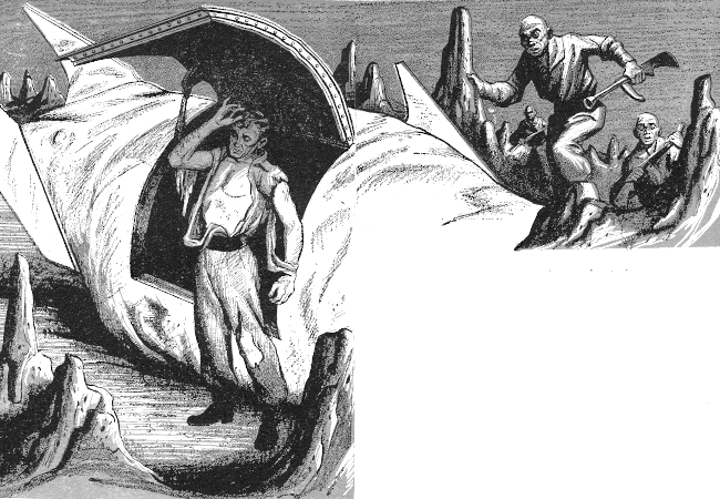 For a moment, the cold-eyed trio paused beneath the ship, adjusting breather-masks and checking short-barreled blasters. Then, spreading out, they moved warily towards the rock pillar behind which their quarry had disappeared.
