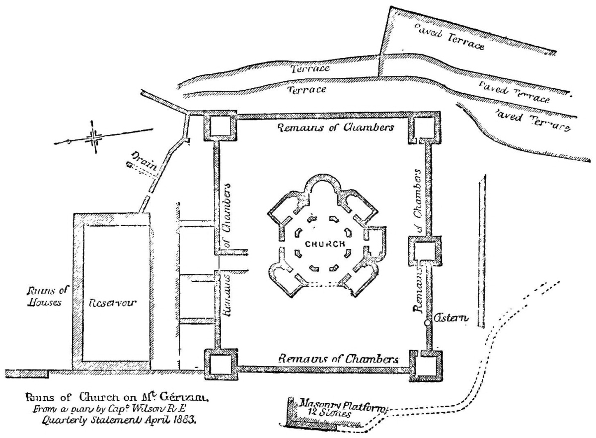 [99] The church is octagonal. On the east side is an apse; on the north the main entrance. On five sides there are small chapels, and on the eighth probably a sixth. There is an inner octagon, which gives the place some resemblance to that of the Dome of the Rock. The only capital uncovered was of a debased Corinthian order. The church is believed to have been built by Justinian circa 533.