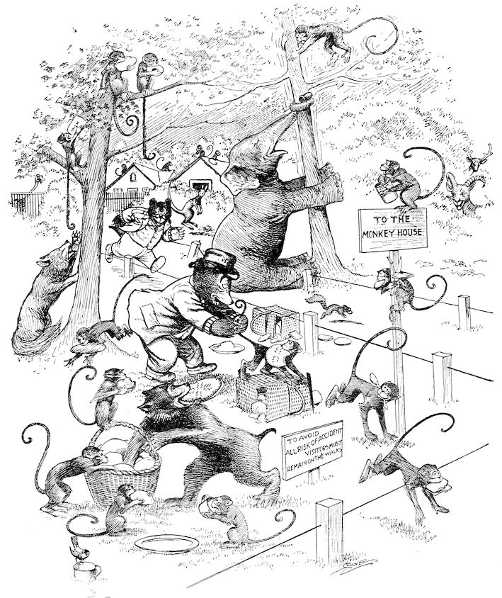 This book records in complete detail the wonderful trip of the Roosevelt Bears from their cave in the Rocky Mountains to New York City. It tells how these Bears entertained their animal friends at home, of the exciting race to catch the Pullman train, the eventful night on the sleeping car and the exciting adventures on the Kansas farm. Of the day spent in rollicking fun at the district school, the adventures at the county fair and the overnight trip in the balloon which took them from Missouri to Chicago, where they landed in Lincoln Park and spent some days in entertaining the children of that city, and seeing all the points of interest, including the Athletic Club and a modern department store.