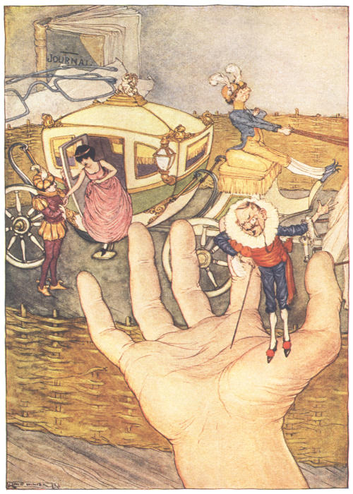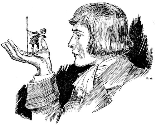 I then made another sign that I wanted drink. They found by my eating that a small quantity would not suffice me; and being a most ingenious people, they slung up, with great dexterity, one of their largest hogsheads, then rolled it towards my hand, and beat out the top; I drank it off at a draught, which I might well do, for it did not hold half a pint, and tasted like a small wine of[12] Burgundy, but much more delicious. They brought me a second hogshead, which I drank in the same manner, and made signs for more: but they had none to give me. When I had performed these wonders they shouted for joy, and danced upon my breast, repeating several times as they did at first, Hekinah degul. They made me a sign that I should throw down the two hogsheads, but first warned the people below to stand out of the way, crying aloud, Borach mevola: and when they saw the vessels in the air there was a universal shout of Hekinah degul. I confess I was often tempted, while they were passing backwards and forwards on my body, to seize forty or fifty of the first that came in my reach and dash them against the ground. But the remembrance of what I had felt, which probably might not be the worst they could do, and the promise of honor I made to them—for so I interpreted my submissive behavior—soon drove out these imaginations. Besides, I now considered myself as bound by the laws of hospitality to a people who had treated me with so much expense and magnificence. However, in my thoughts I could not sufficiently wonder at the intrepidity of these diminutive mortals, who durst venture to mount and walk upon my body while one of my hands was at liberty, without trembling at the very sight of so prodigious a creature as I must appear to them. After some time, when they observed that I made no more demands for meat, there appeared before me a person of high rank from his imperial majesty. His excellency, having mounted on the small of my right leg, advanced forwards up to my face, with about a dozen of his retinue, and producing his credentials under the signet royal, which he applied close to my eyes, spoke[13] about ten minutes without any signs of anger, but with a kind of determinate resolution: often pointing forwards, which, as I afterwards found, was towards the capital city, about half a mile distant, whither it was agreed by his majesty in council that I must be conveyed. I answered in few words, but to no purpose, and made a sign with my hand that was loose, putting it to the other (but over his excellency’s head for fear of hurting him or his train), and then to my own head and body, to signify that I desired my liberty. It appeared that he understood me well enough, for he shook his head by way of disapprobation, and held his hands in a posture to show that I must be carried as a prisoner. However, he made other signs, to let me understand that I should have meat and drink enough, and very good treatment. Whereupon I once more thought of attempting to break my bonds; but again, when I felt the smart of their arrows upon my face and hands, which were all in blisters, and many of the darts still sticking in them, and observing likewise that the number of my enemies increased, I gave tokens to let them know that they might do with me what they pleased. Upon this the hurgo and his train withdrew, with much civility and cheerful countenances. Soon after I heard a general shout, with frequent repetitions of the words, peplom selan; and I felt great numbers of people on my left side relaxing the cords to such a degree that I was able to turn upon my right. But, before this, they had daubed my face and both my hands with a sort of ointment, very pleasant to the smell, which in a few minutes removed all the smart of their arrows. These circumstances, added to the refreshment I had received by their victuals[14] and drink, which were very nourishing, disposed me to sleep. I slept about eight hours, as I was afterwards assured; and it was no wonder, for the physicians, by the emperor’s order, had mingled a sleepy potion in the hogsheads of wine.