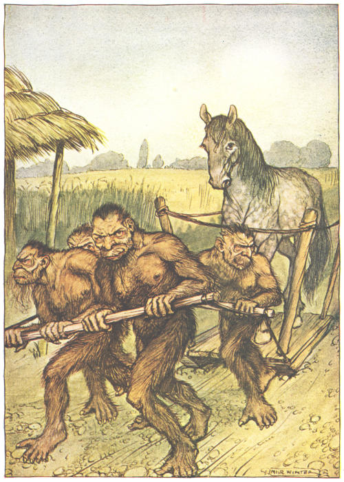 The Houyhnhnms use the hollow part between the pastern and the hoof of the forefoot, as we do our hands, and this with greater dexterity than I could at first imagine. I have seen a white mare of our family thread a needle (which I lent her on purpose) with that joint. They milk their cows, reap their oats, and do all the work which requires hands, in the same manner. They have a kind of hard flints, which by grinding against other stones, they form into instruments, that serve instead of wedges, axes, and hammers. With tools made of these flints, they likewise cut their hay, and reap their oats, which there grow naturally in several fields; the yahoos draw home the sheaves in carriages, and the servants tread them in certain covered huts to get out the grain, which is kept in stores. They make a rude kind of earthen and wooden vessels, and bake the former in the sun.