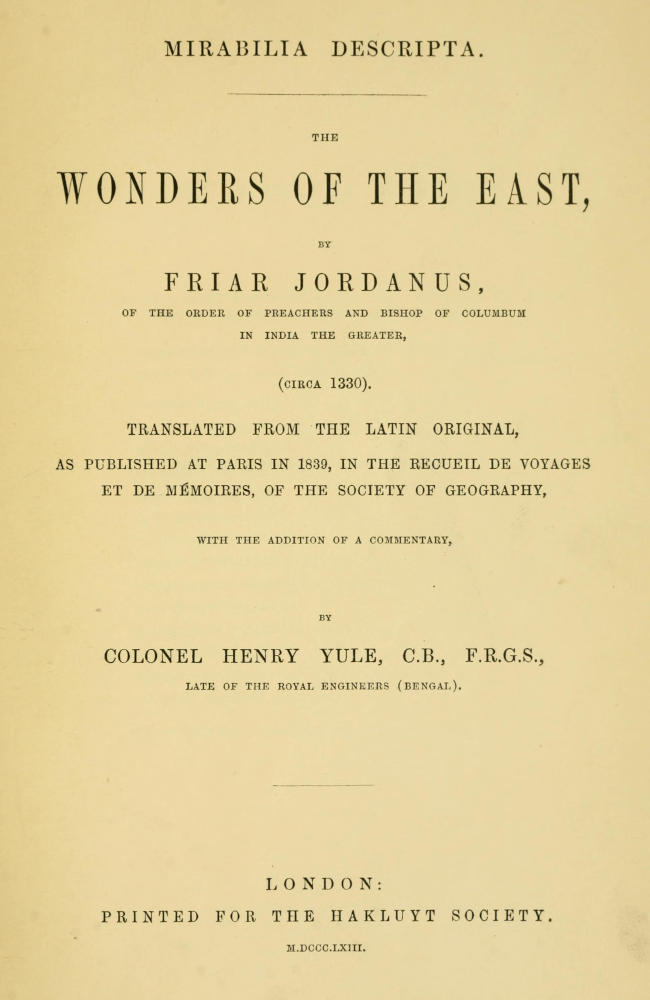 Like many other old travellers of more fame, whilst endeavouring to speak only truth of what he has seen, Jordanus retails fables enough from hearsay. What he did see in his travels was so marvellous to him, that he was quite ready to accept what was told him of regions more remote from Christendom, when it seemed but in reasonable proportion more marvellous. If there were cats with wings in Malabar,[ii] as he had seen,[1] why should there not be people with dogs’ heads in the Islands of the Ocean?[2] If black men cut off their own heads before their gods at Columbum,[3] why should not “white and fat men” be purchased as delectable food in Java?[4] If there were rats nearly as big as foxes in India Major,[5] why should there not be rocs that could fly away with elephants in India Tertia?[6]