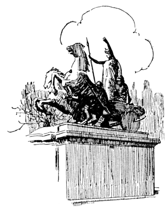 Before Betty could answer, they had reached the end of Westminster Bridge and turned on to the Embankment. Raised on the end parapet of the bridge, was a group of statues in which the chief figure was a woman in flowing robes furiously driving a strange-looking chariot.