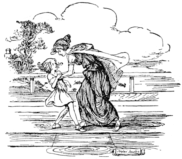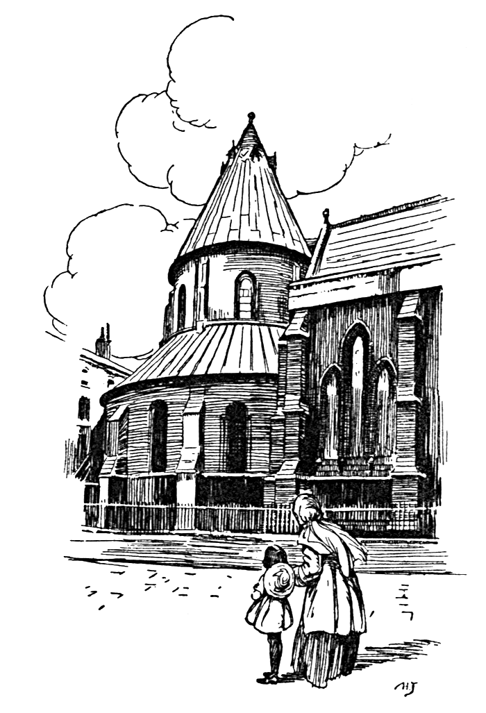“A famous actor of the eighteenth century and one of Dr. Johnson’s friends. He acted at Drury Lane Theatre where, eighty years or so before his time, Pepys, you remember, used to go to see the pretty actress, Nell Gwynne. But you will read about these eighteenth-century people when you are older, and perhaps feel as I do, that you know them all very well. Take a last look at this Adelphi, because it’s a good example of the sort of architecture that belongs to the time of George the Second and Third. There are many other eighteenth-century streets and nooks and corners scattered about London among the forest of new buildings that has sprung up since the reign of George the Second. But I shall leave you to find them for yourself. It will make a nice occupation for you when you go for a walk! Now we must rush home if we want any lunch to-day.”