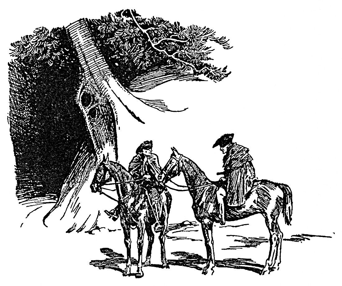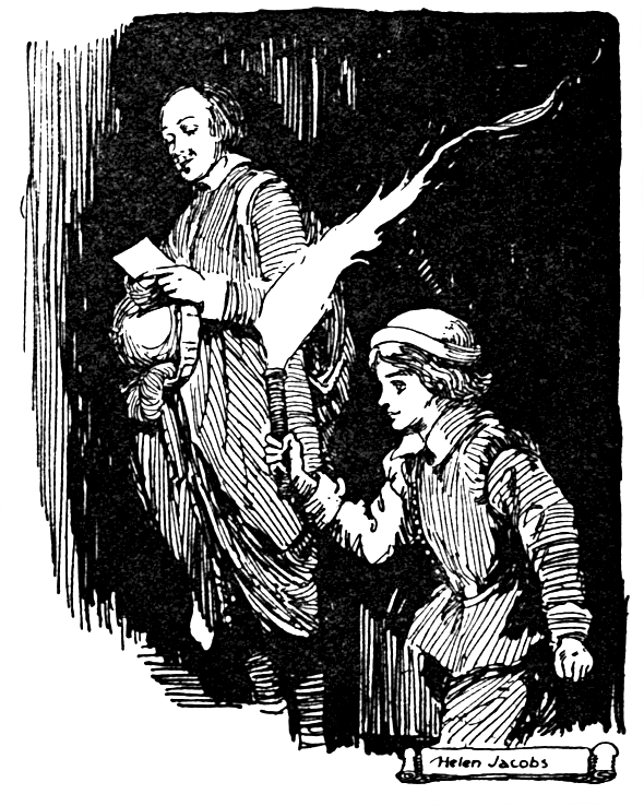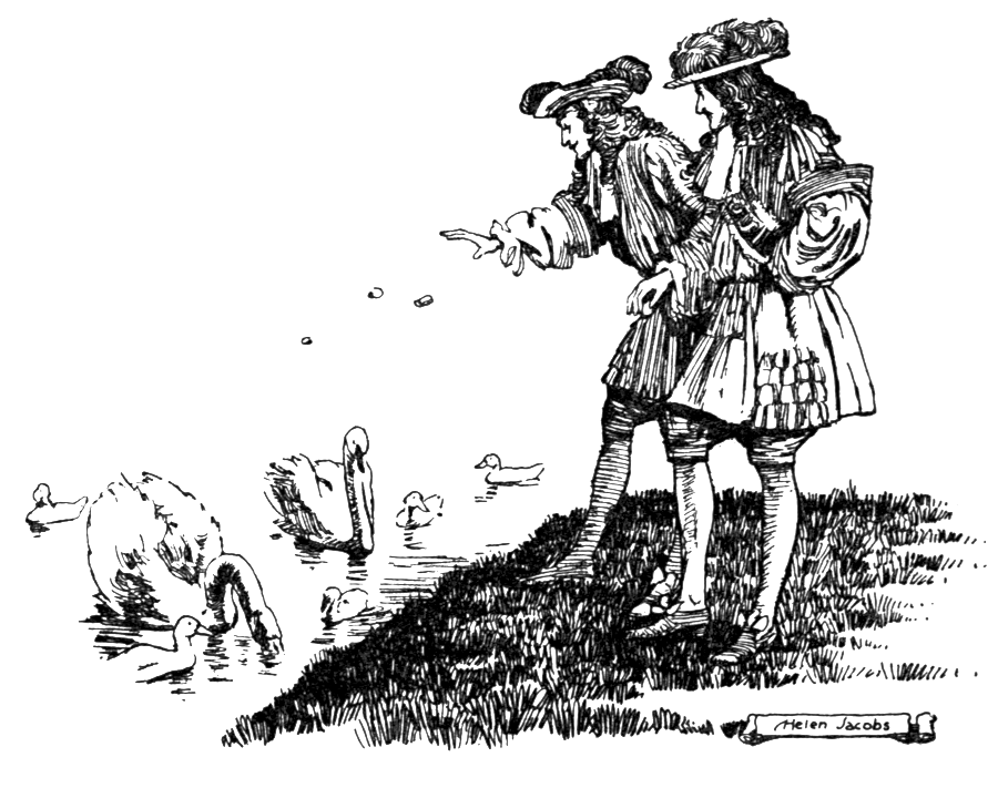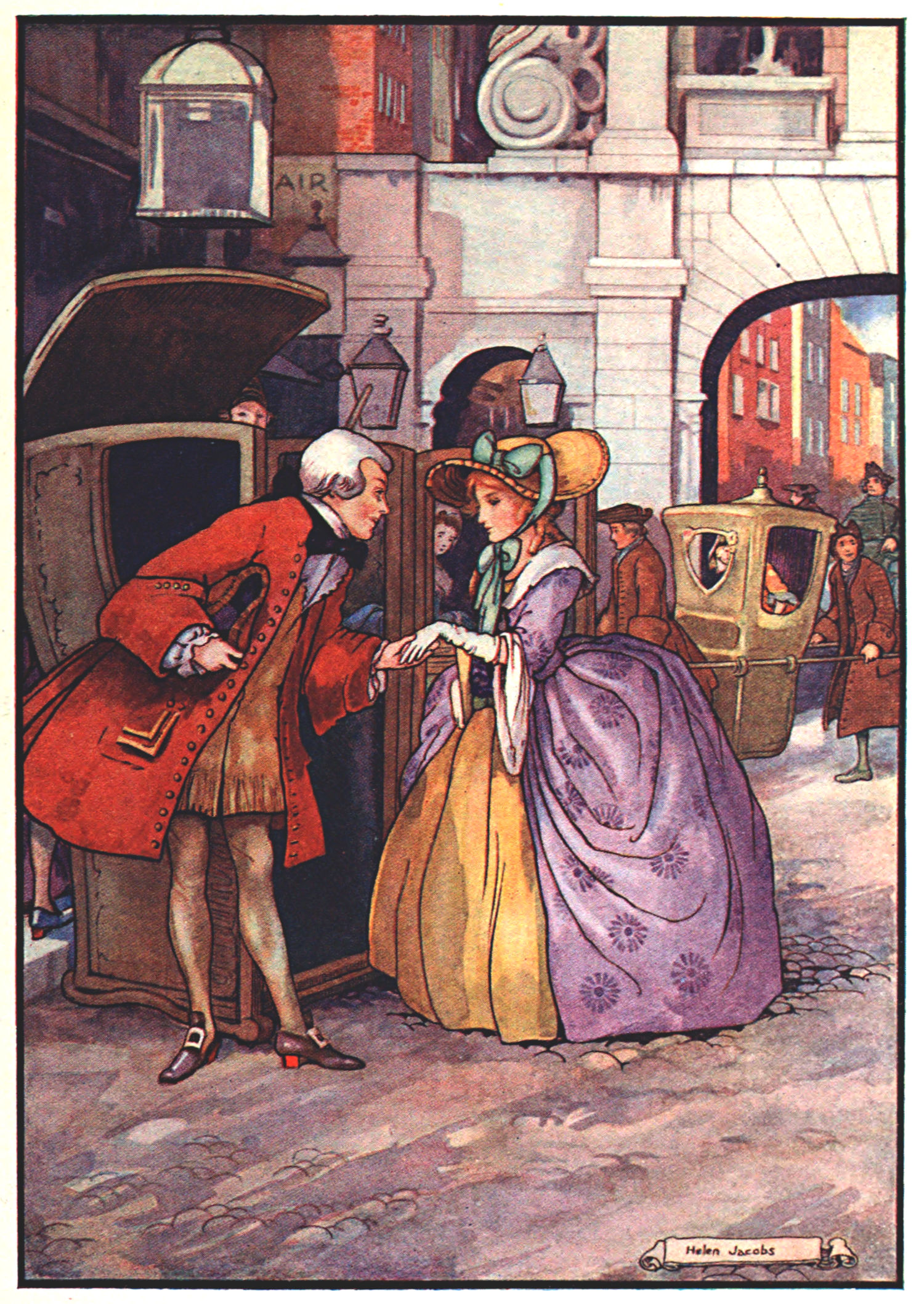 Even the more plainly-dressed business men, she thought, looked nice in their knee-breeches, brown stockings and ruffled shirts. But every now and then, beautifully-dressed young men passed her, wearing flowered waistcoats, white or coloured satin coats and silk stockings with knee-breeches. Their swords were fastened with broad sashes round the waist. Dainty lace ruffles fell over their hands. Under their arms they carried three-cornered hats, trimmed with gold lace, and their hair, rather long and powdered, was tied with a black ribbon. Nearly all of them carried gold snuff-boxes, and long gold-handled canes.
