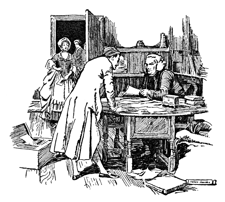 “Very likely. I see many well-known people. There’s Oliver Goldsmith in the claret-coloured velvet coat. He’s much tidier and better dressed than usual! And do you notice that little man, rather deformed, in black satin, with ruffles of lace? That’s Mr. Pope, the poet. He is very witty. You see how he is surrounded by laughing men and women? But they’re all rather afraid of him, for he’s quite likely to make fun of them in his next poem.”