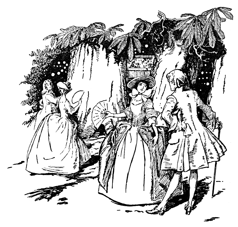 The “round thing” of which she had caught sight between trees, she now saw to be a sort of dome, beneath which was a circle of gilded and painted recesses, something like the boxes in[Pg 168] a theatre. From a pavilion in the middle of the covered part of the gardens, came the sound of music, and in every recess ladies and gentlemen were seated before little tables with glasses and cups upon them. With the dome, or Rotunda, as Godmother called it, as a centre, long alleys of trees stretched in every direction, like the spokes of a wheel, and were lighted by lamps hanging from the trees. The whole place indeed sparkled with lights, and in their radiance walked charming figures. Pretty ladies in gowns of brocade with powdered hair[Pg 169] and little black patches on their faces, were escorted by gentlemen no less charming in their satin coats, flowered waistcoats and three-cornered hats. They walked up and down the leafy alleys, sometimes stopping before platforms where people were singing or acting, sometimes greeting other parties of friends with low curtsies from the ladies and deep bows from the gentlemen.