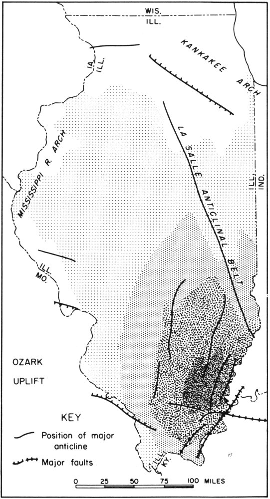 The structural map of Illinois (figure 6) shows the position of the major geologic structures. The big basin is indicated by shading, with the darkest pattern showing where the basin is deepest. The same strata that lie at sea level at the basin’s outer edge are downwarped to 6,000 feet below sea level in its deepest part. Axes of some small anticlines and locations of major fault zones also are shown.