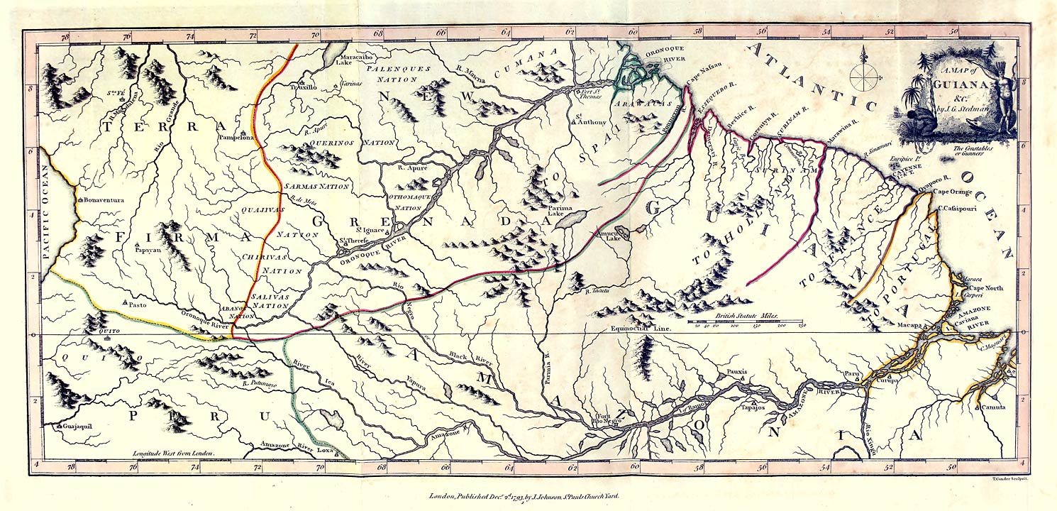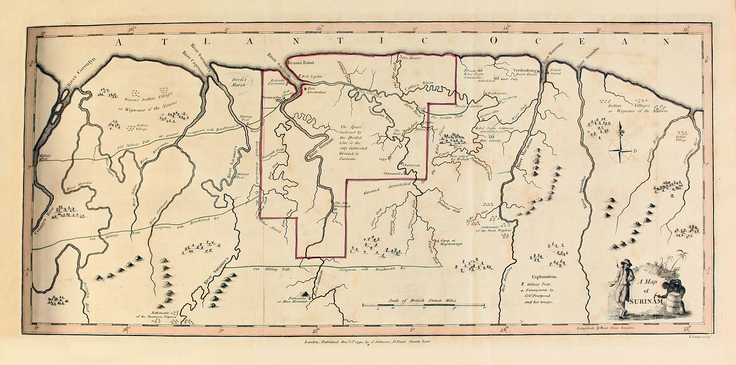 The exploring of foreign countries having of late years, and particularly since the recent discoveries of the immortal Captain Cook, so generally been the object of persons both in private and public situations; and the histories of their labours and pursuits being so interesting to the curiosity of the public, I have ventured to offer such observations as I have had an opportunity of making in a very singular part of the globe, on which few Englishmen have been thrown, either by accident [2]or curiosity. The colony of Surinam, in Dutch Guiana, so far as it is inhabited and cultivated by Europeans near the sea-coast, has indeed been known for many years past. But the deep inundations, with the impenetrable thickness of the woods, have been such constant discouragements and obstructions to discovery, that but very little true information concerning that country has as yet been obtained, except what relates to such objects of commerce as are common to most of the tropical settlements. This publication, therefore, is chiefly intended to particularize such circumstances and events as the necessity of penetrating into the interior parts of the country have enabled me to make, and forced on my observation.