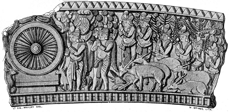| DEER WORSHIPPING THE WHEEL OF THE LAW. Tope of Sanchi, drawn by Lieut.-Col. Maisey From Fergusson’s “Tree and Serpent Worship.” By permission of the India Office. |
