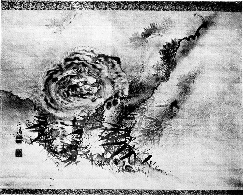 | THE BUDDHISTIC TIGER From a painting on silk by Ko-Tō in the British Museum. Photographed for this work. In Japanese Buddhism the Tiger is the type of Wisdom. |
