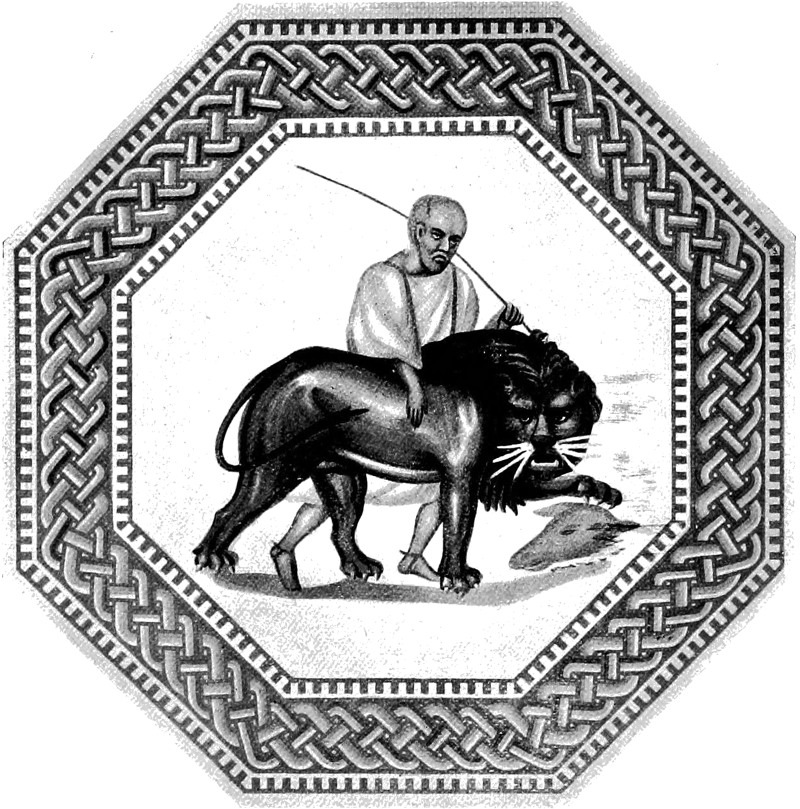 | LION BEING LED FROM THE ARENA BY A SLAVE From the mosaic pavement of a Roman villa at Nennig. |