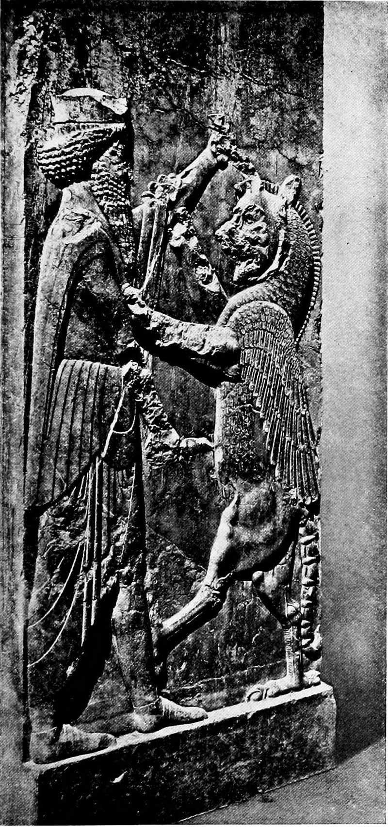 | 10KING FIGHTING GRIFFIN (“BAD ANIMAL”) Relief in Palace of Darius at Persepolis. Photographed by Jane Dieulafoy. From “L’Art Antique de la Perse.” By permission of M. Marcel Dieulafoy. |