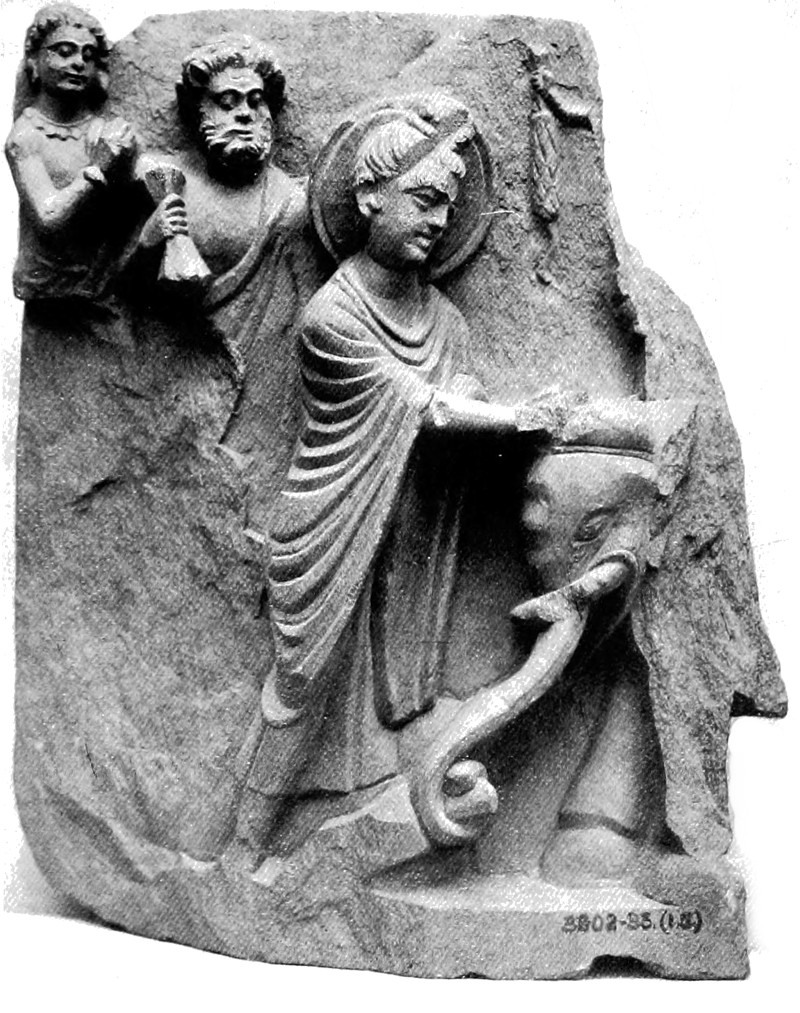 | BUDDHA PACIFYING AN INTOXICATED ELEPHANT WHICH HAD BEEN SENT TO DESTROY HIM. THE ELEPHANT STOOPS IN ADORATION Græco-Buddhist sculpture from a ruined monastery at Takt-i-Bahi. India Museum. Photographed for this work. |