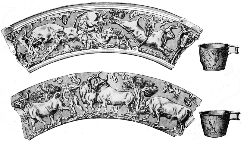 | WILD BULLS AND TAMED BULLS Reliefs on two gold cups found in a tomb at Vapheio near Amyclae. Fifteenth century B.C. (possibly earlier). From Schuckhardt’s “Schliemann’s Excavations.” By permission of Messrs. Macmillan & Co., Ltd. |