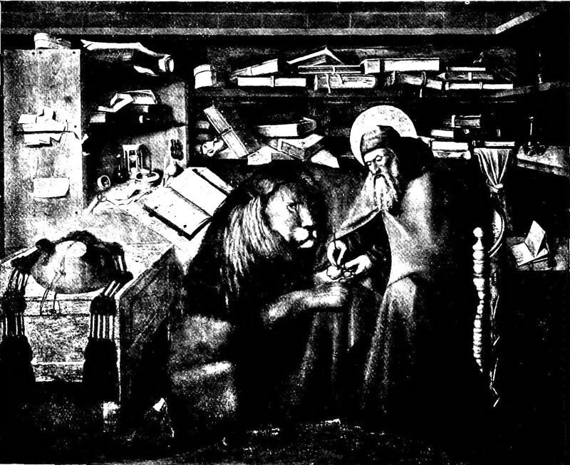 | ST. JEROME EXTRACTING A THORN FROM THE PAW OF A LION By Hubert van Eyck. Naples Museum. (Anderson.) |