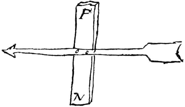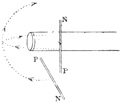 “From the preceding facts we may likewise collect that this conflict performs circles; for without this condition, it seems impossible that the one part of the uniting wire, when placed below the magnetic pole, should drive it towards the east, and when placed above it towards the west; for it is the nature of a circle that the motions in opposite parts should have an opposite direction.”—H. C. Oersted, Ann. of Phil., Oct., 1820, pp. 273–276.