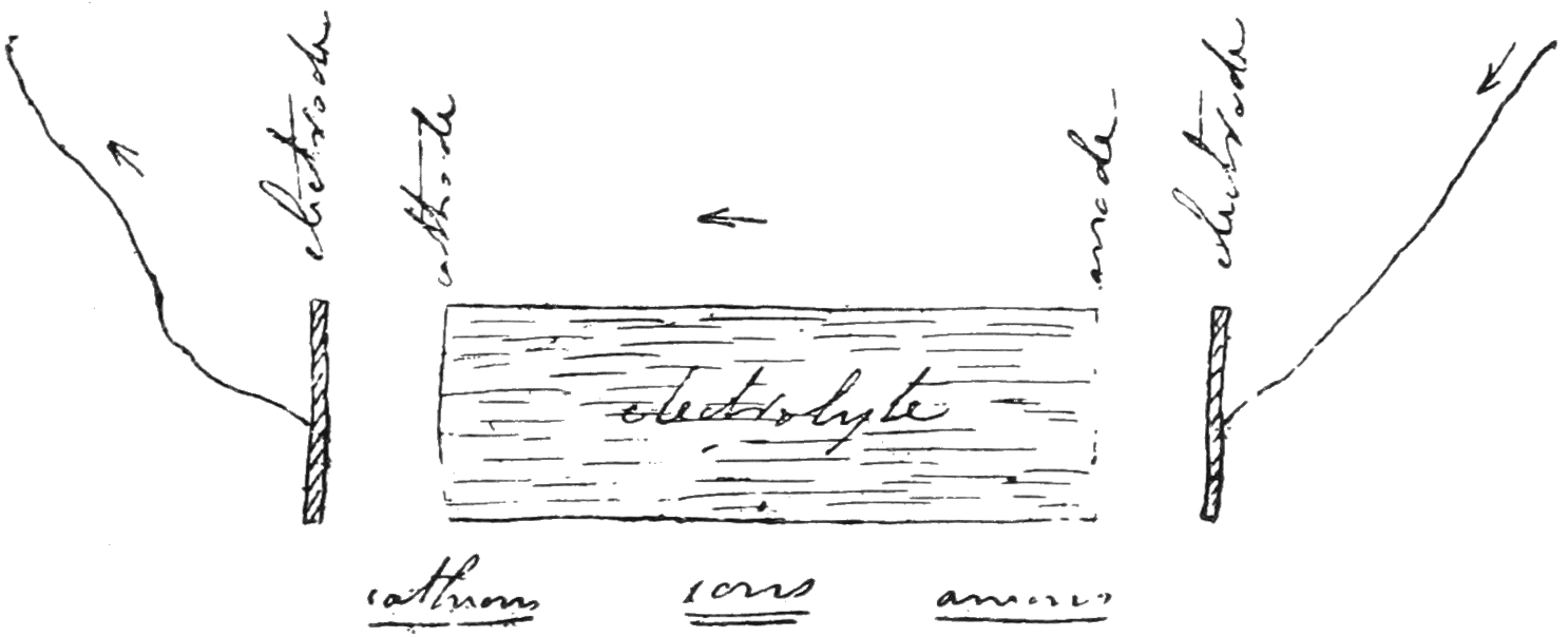 42 From ἄνω upwards and ὁδός a way; and κατά downwards and ὁδός a way. The words cathode and cation are now more usually spelled kathode and kation. Faraday sometimes spelled the word cathion (Exp. Res. Art. 1351), as did also Whewell (Hist. of Ind. Sciences, vol. iii. p. 166).