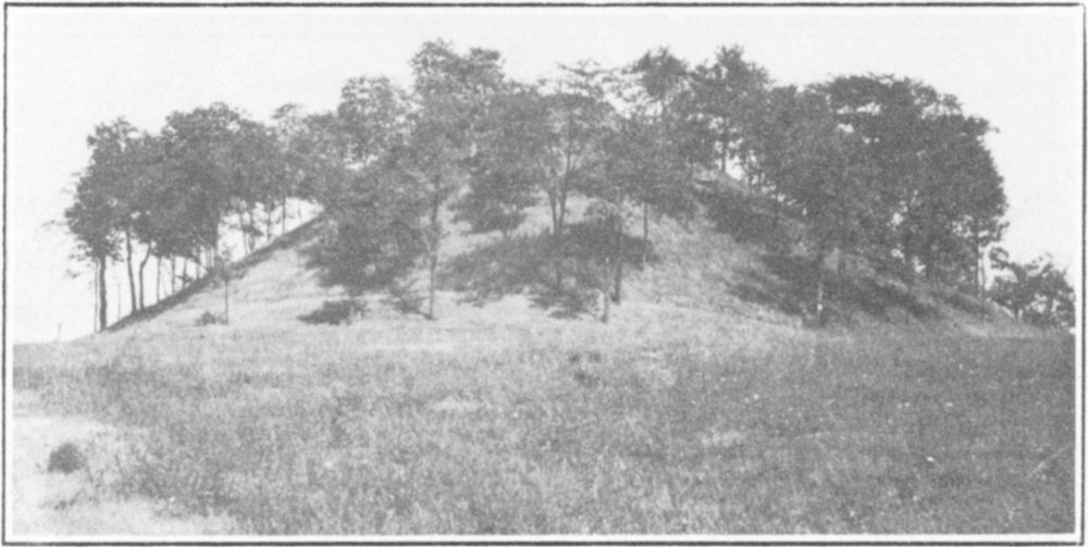 Let us imagine that our Mound is located in Ross County, in the charming Paint Creek Valley, somewhere near old Chillicothe, first capital of Ohio and ancient capital of the Mound-builders. Before us stands a mound of earth, 125 feet in diameter at its base and 25 feet in height. The field in which it stands is under cultivation but the mound itself, being too steep for farming purposes, is covered by a thicket of shrubbery and trees. An exploration party has arrived on the scene and is preparing to examine this ancient earthwork.