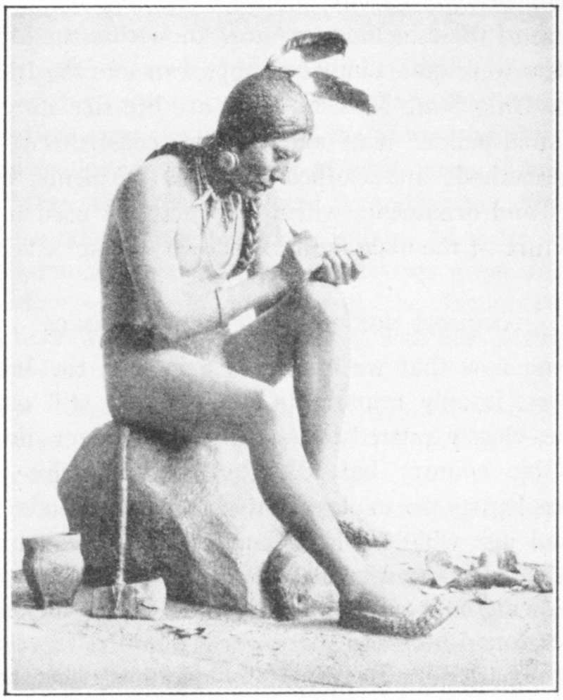 Primitive man used Stone a long time before finding what proved to be a very superior variety, Flint, a rough block of which is shown on the left in the picture. Possibly he chanced upon a piece of Flint and in using it as a Hammer Stone noticed that it broke into thin flakes with sharp edges, and with this knowledge he soon learned to make Flint Knives, Scrapers, Arrow-points, Drills, and other cutting and piercing tools. For example, from the rough piece of Flint, “A,” the arrowmaker struck off a few flakes with his Stone Hammer, producing the piece marked “B,” which has something of the shape of the final point. Then by means of the chipping tool of deer antler, marked “E,” he pressed off thin flakes from the edges of “B,” and produced “C,” and finally the finished point, “D.”