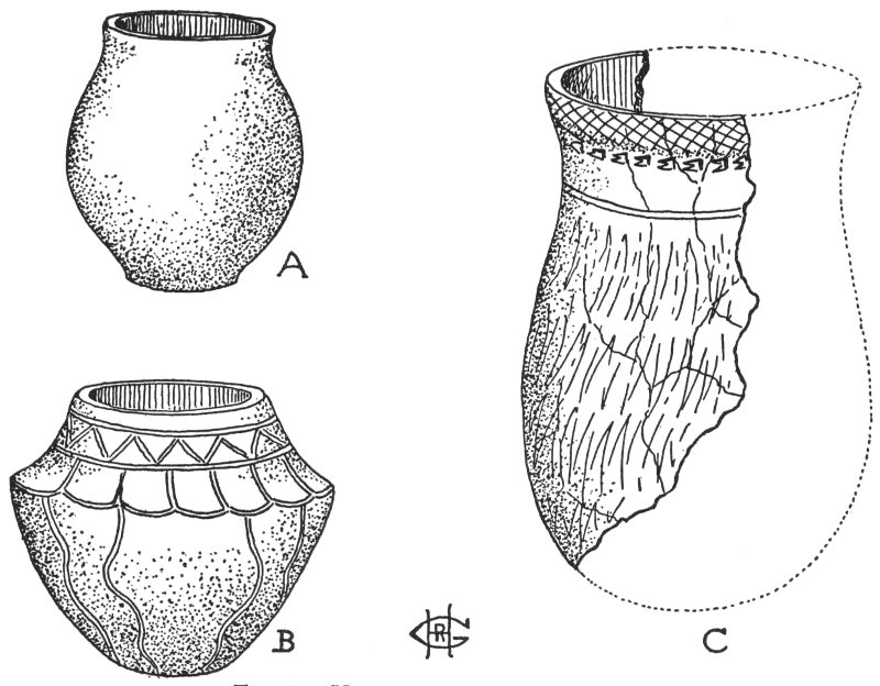 Having met the archæologist, we may now get an insight into the interiors of the mounds, cemeteries and village-sites of the Mound-builders. Let us go ahead of our story for a moment and explain that archæologists, as a result of their explorations, have found that there were numerous kinds, or cultures as he calls them, of Mound-builders. While all of them were closely related, and belonged to the same race, they differed greatly among themselves in manners and customs. Some of them were rather highly advanced in their civilization, 13 while others were rather backward, just as is true of the various tribes and nations of Indians of later or historic times. With some of them the trait or habit of building mounds was very important while with others it was only a sort of “side-line.” Some of them merely placed their dead upon the surface and piled earth above the remains to form a Mound, while others prepared carefully made tombs of logs within the Mound for the dead. Some were skilled in the use of copper and silver, the weaving of cloth and the making of potteryware, while others contented themselves with only flint and stone and the simpler arts of living.