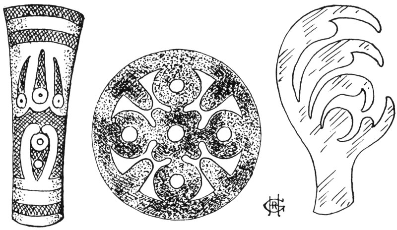 At the left in the picture is a section of a human leg bone carved with an attractive design. This was no doubt a sort of family relic or a memento of some relative who had died. In the middle of the picture is a rare design, possibly representing the universe, cut from a thin sheet of copper. At the right is the foot of an eagle, cut out of a thin sheet of mica, as skillfully as anyone could do it today.