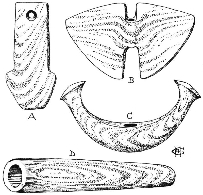 Almost every collection of “Indian relics” contains one or more specimens, like those shown above, that are difficult to account for. They are called by the Archæologists “Ceremonial” objects, because they are believed to have been used in mysterious ceremonies of the Mound-builders and Indians. The specimen marked “A” is a pendant or Gorget, and was worn suspended from the neck. Specimen “B” is a Bannerstone, and “C” is a Crescent. They probably were mounted on wooden handles and served as badges of authority or rank. Other Ceremonial objects are tubes (D), Cones, Bars, Bird-shaped objects, called Bird-stones, and others.